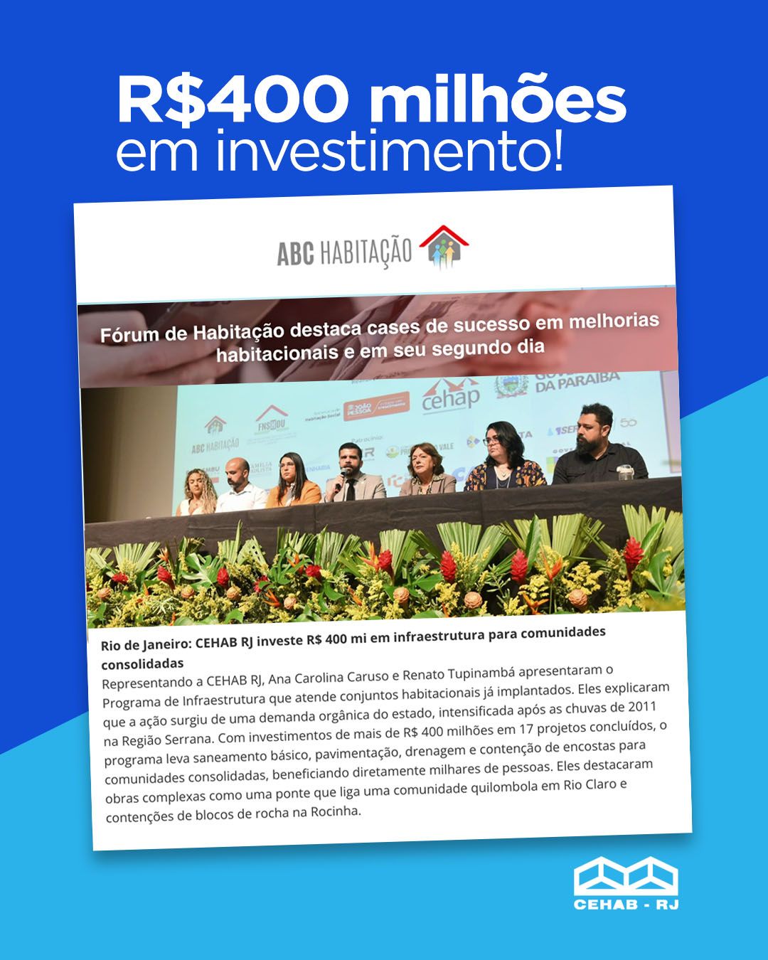 Com investimentos que somam mais de R$400 milhões em obras já concluídas, a CEHAB apresentou experiências desenvolvidas no Estado do Rio de Janeiro em comunidades consolidadas, que incluem obras de saneamento, pavimentação, drenagem e contenção de encostas, beneficiando diariamente milhares de pessoas em diferentes municípios.