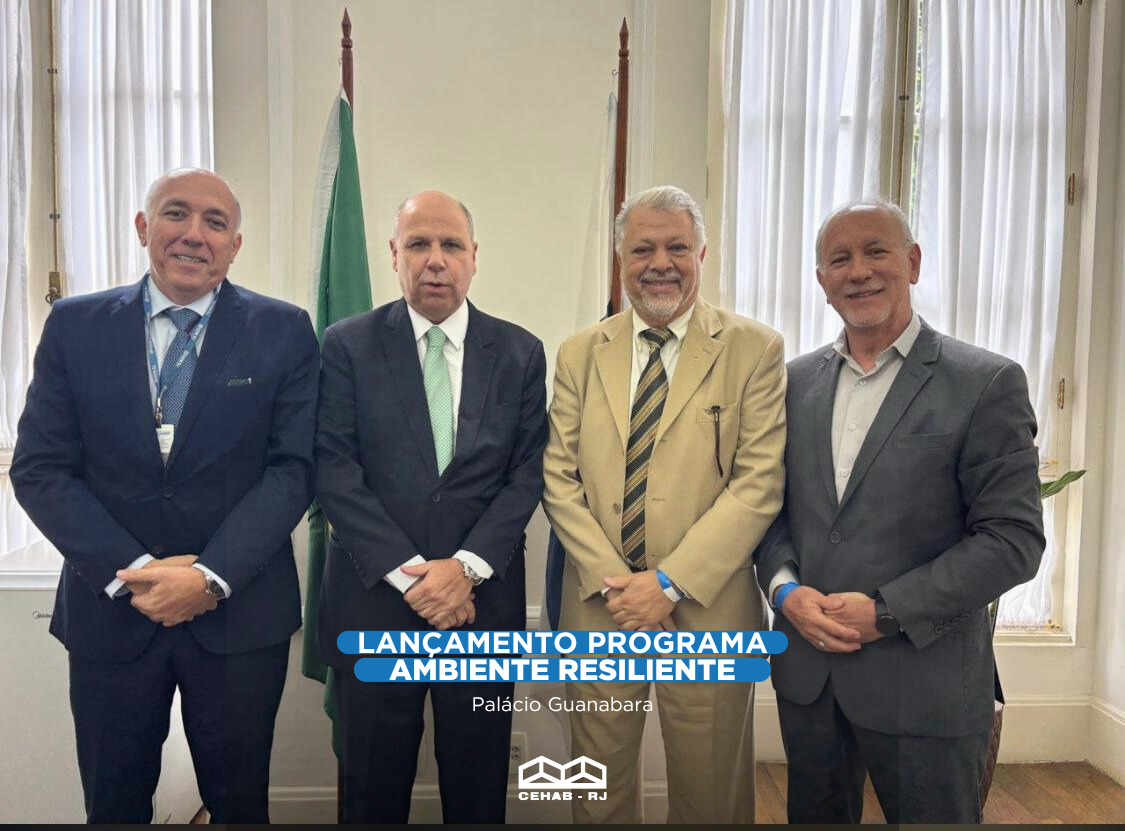 Na manhã desta quinta-feira (06/11), o presidente da CEHAB-RJ, Reginaldo Jardim, e o diretor de Projetos e Obras, Luiz Rafael Mussi, participaram do lançamento do *Programa Ambiente Resiliente*, no Palácio Guanabara. A iniciativa do Governo do Estado, anunciada pelo governador Cláudio Castro, busca fortalecer a resiliência dos municípios fluminenses frente aos desafios climáticos.