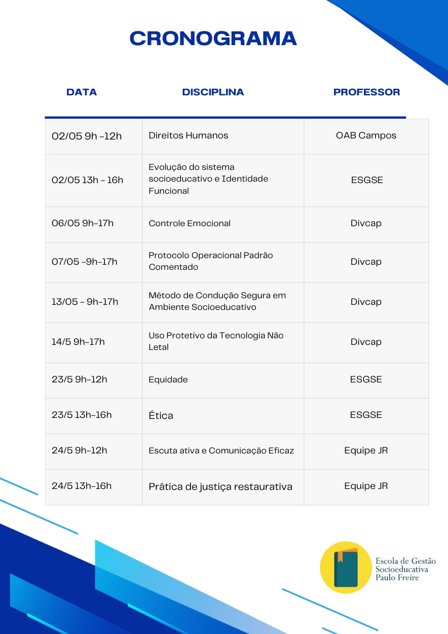 O objetivo do curso é promover diálogos baseados nos princípios legais que regem a doutrina da proteção integral da criança e do adolescente, oferecendo formação em práticas humanizadas de segurança em ambiente socioeducativo.