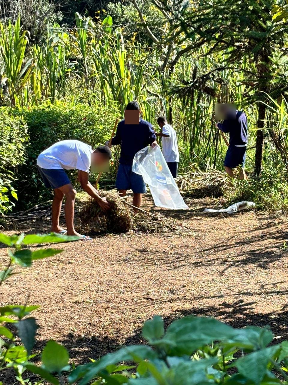 Nesta parte inicial do projeto, os adolescentes participaram da limpeza do local escolhido para o recomeço do plantio, tendo seu primeiro contato com o preparo do solo, irrigação e separação de folhas que serão utilizadas como adubo.