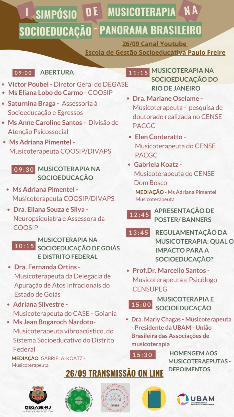 No dia 26 de setembro, das 9h às 16h, ocorrerá o I Simpósio de Musicoterapia na Socioeducação, uma iniciativa que visa discutir e promover a importância dessa prática terapêutica no contexto socioeducativo brasileiro. O evento é promovido pelo Departamento Geral de Ações Socioeducativas (DEGASE), através da Coordenação de Saúde Integral e Reinserção Social (CSIRS) e da Divisão de Atenção Psicossocial.