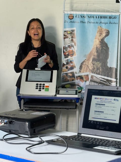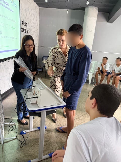 A servidora do Tribunal Regional Eleitoral, Vanessa Siqueira, demonstrou o uso da urna eletrônica e esclareceu dúvidas sobre o dia do pleito, segurança do sistema e etapas da votação. Em seguida, os adolescentes participaram de uma simulação de eleição, utilizando a urna eletrônica para votar em candidatos fictícios, vivenciando na prática o funcionamento do processo democrático.