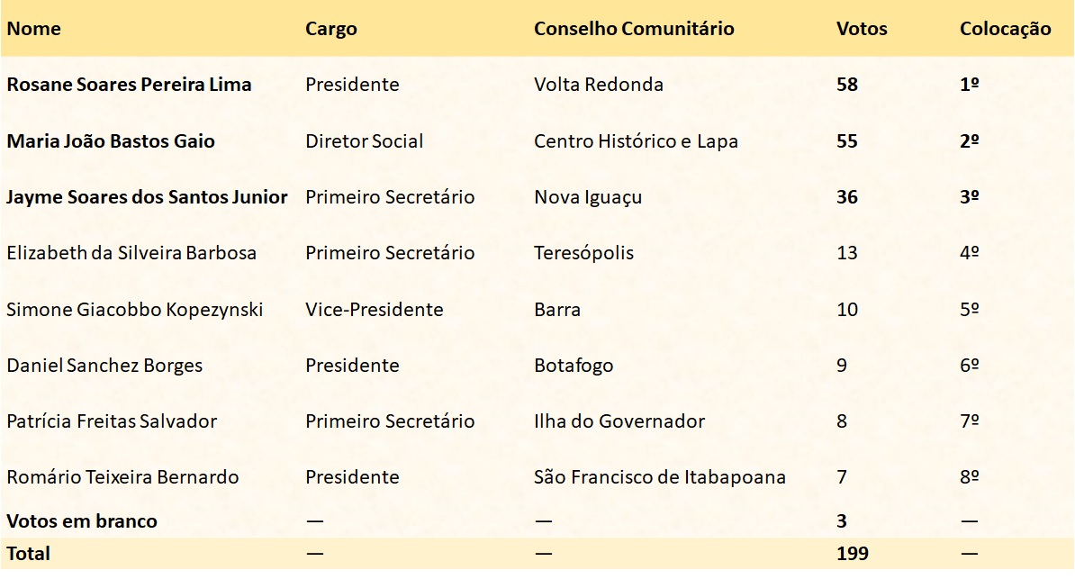 São destinadas três (03) vagas aos Conselhos Comunitários de Segurança (CCS), geralmente preenchidas por um representante titular e dois suplentes. O mandato tem a duração de dois anos e a Coordenadoria dos CCS/ISP é a responsável pela realização deste pleito eleitoral.