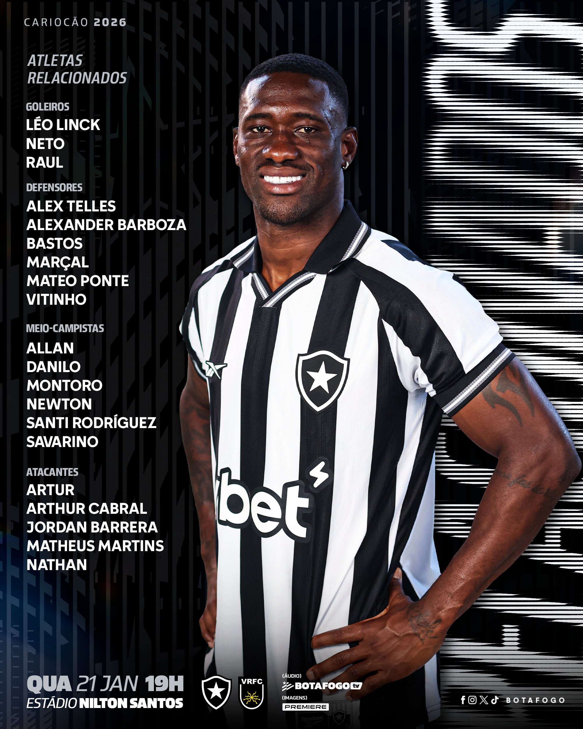 O Botafogo divulgou a lista de relacionados para o confronto diante do Volta Redonda, que acontece nesta quarta-feira (21), às 19h, no estádio Nilton Santos. A partida marcará a estreia dos jogadores do grupo principal na temporada de 2026, além do primeiro jogo à beira do campo do técnico Martín Anselmi.