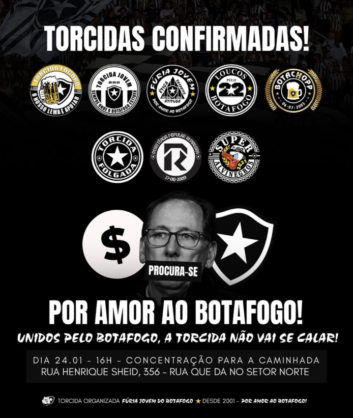 As principais organizadas do Botafogo também estão preparando um protesto contra o norte-americano para antes do jogo contra o Bangu, neste sábado. O ato acontecerá nas imediações do estádio Nilton Santos, a partir das 4 da tarde, na Rua Henrique Scheid, que dá acesso ao setor Norte do Engenhão.