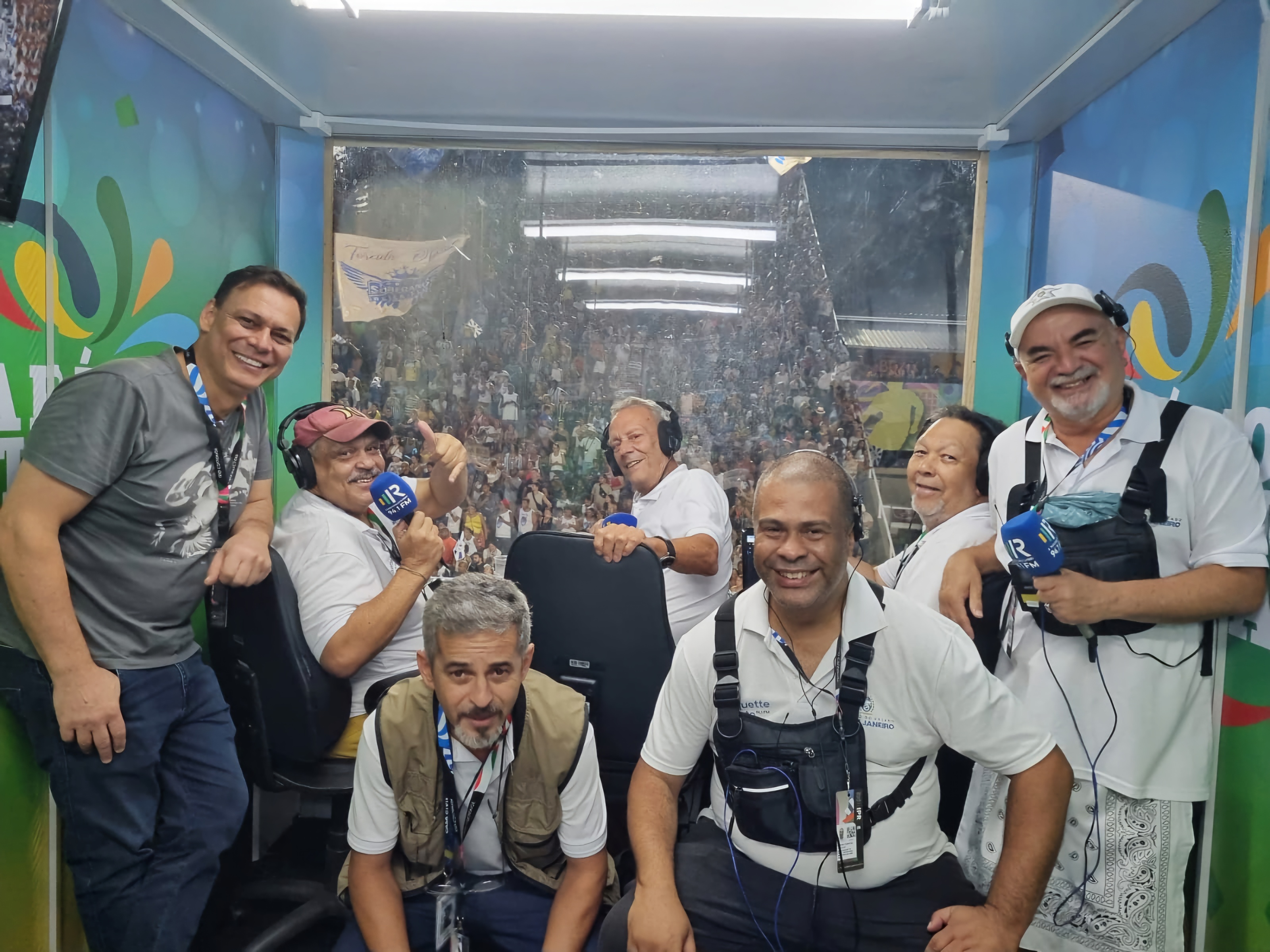 Na foto: o presidente da Rádio Roquette-Pinto, Fernando Nogueira; o apresentador Miro Ribeiro; os comentaristas Sergio Professor e Zé Paulo Pessoa; os repórteres Paulo Coutinho e Marcelo Pacifico; e o coordenador operacional João Marcelo.